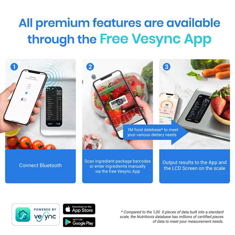 We got you covered! Our innovative scale integrates seamlessly with the Nutritionix database, offering access to over one million food items.
